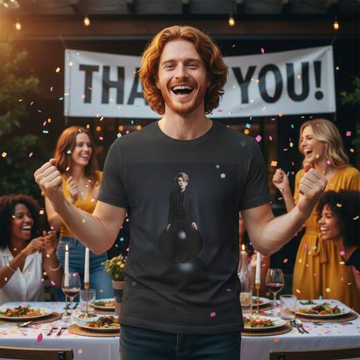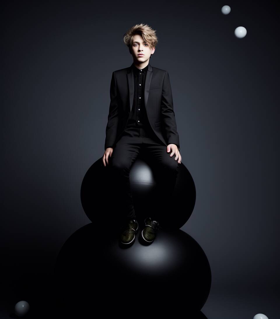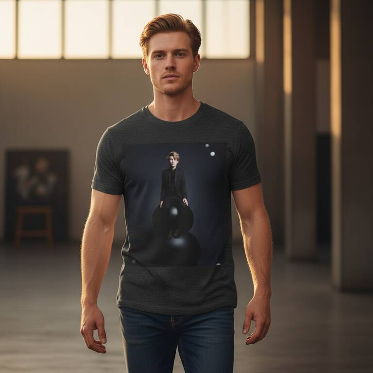 A solitary portrait of a young person perched on two oversized black spheres suggests a calm confidence. Fine photographic tones and subtle highlights make this shirt feel like quiet armor for a modern day. The spare arrangement and soft glow create an editorial, minimalist mood that appears refined. You will wear it to casual gatherings or everyday outings when you want to feel poised and comfortable.