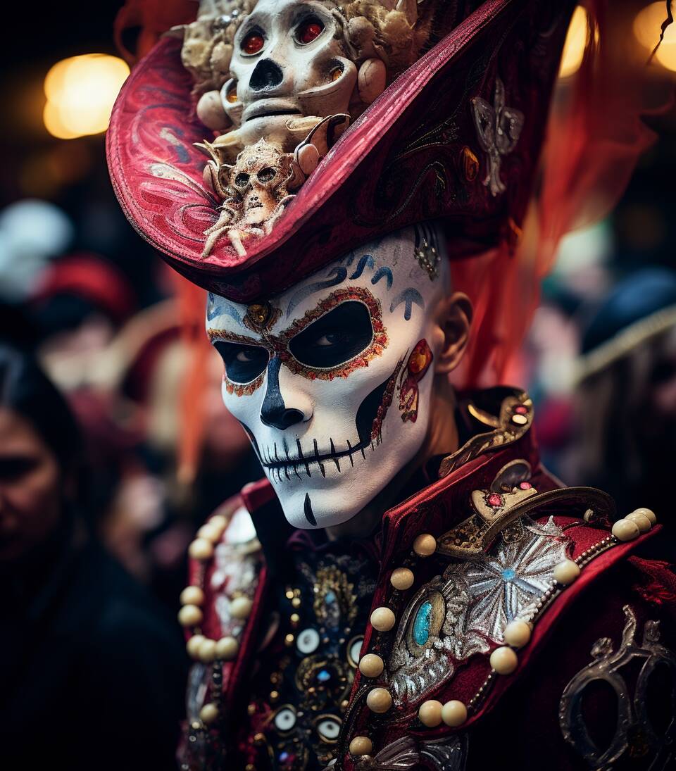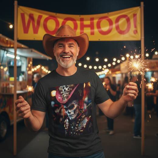 A skull-masked cavalier in ornate regalia fixes a knowing gaze. On this shirt the painted calavera face, sculpted skull accents, and beadwork look like a page from a midnight carnival and feel like armor when you wear it. Deep red embellishments, burnished gold details, and flashes of turquoise bring a baroque, theatrical vibe that invites you into a story.