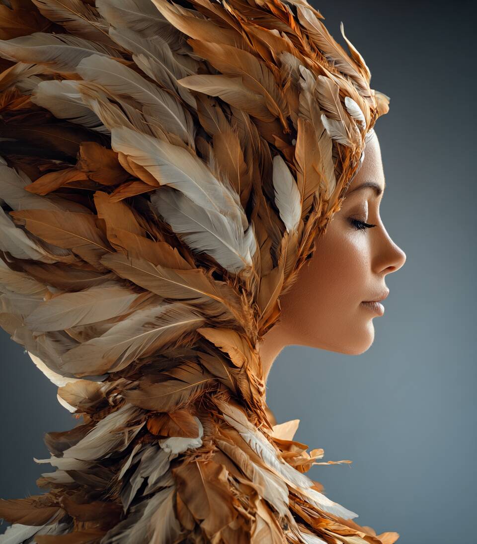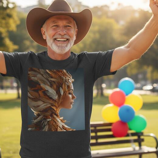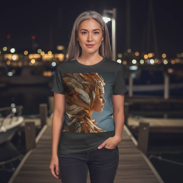A woman in a sweeping feathered hood appears in profile, her face serene against layers of amber and cream plumage. On a shirt, this portrait brings warm, sculptural feathers and a quiet grace, perfect for cozy days and gentle gatherings. Slip into this and you will carry a calm, artful presence when you meet friends or wander through your everyday.