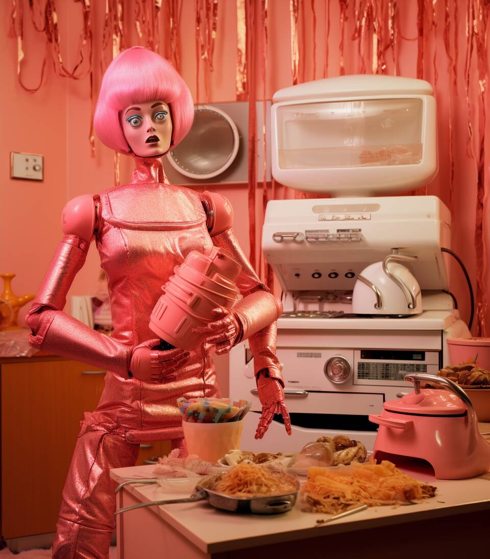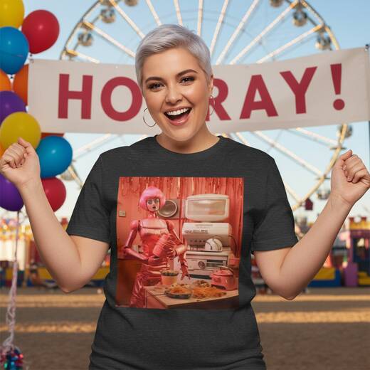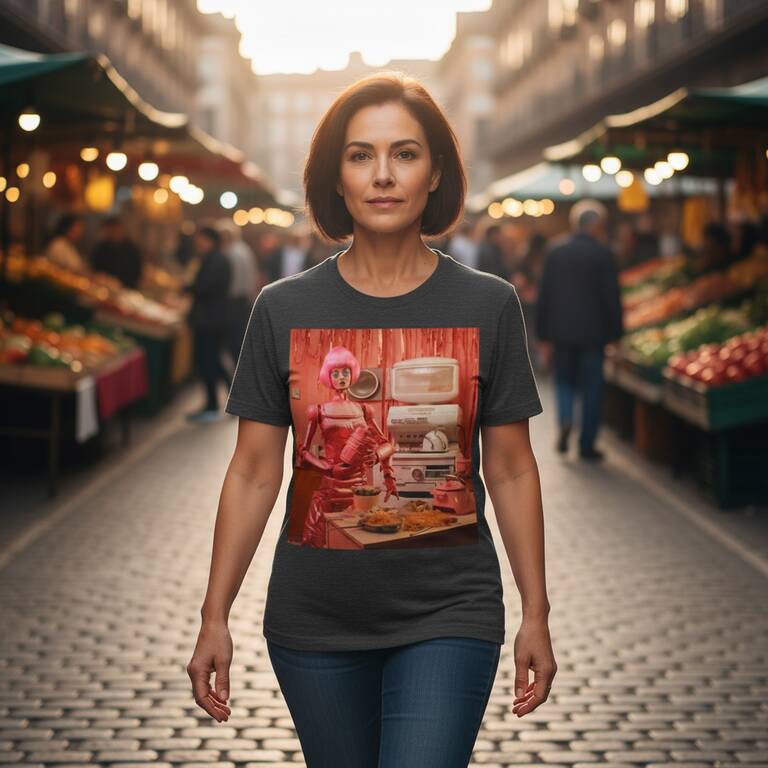 A robot/doll with a shocked face stands in shimmering pink amid retro appliances and scattered pastries, her eyes wide and posture perfectly poised. On a shirt this tableau gives off a campy, cozy mood and a friendly, vintage-future charm. You will love wearing this when catching up over coffee or wandering through weekend markets. The mix of metallic highlights and soft pastels creates a warm, whimsical vibe.