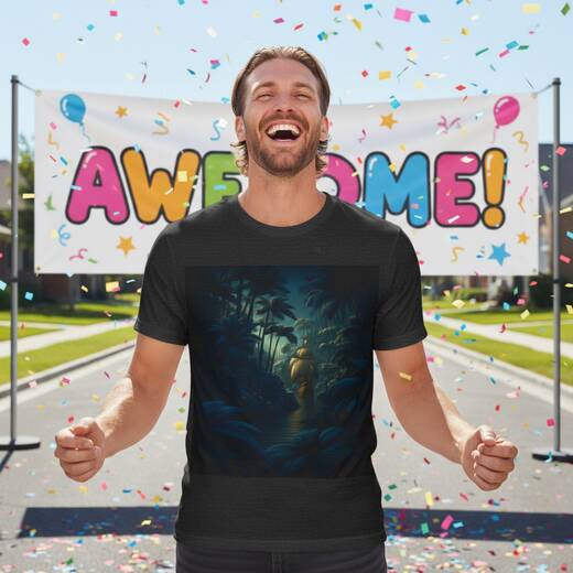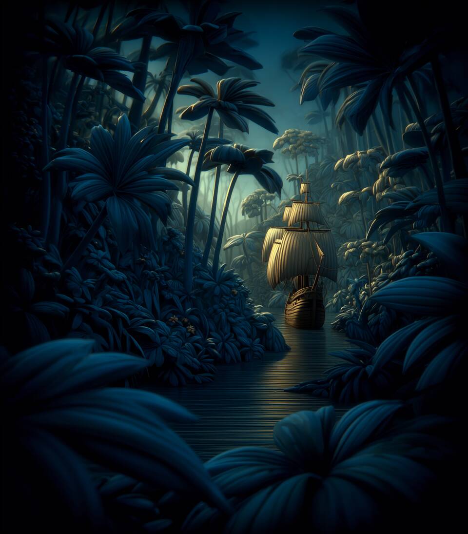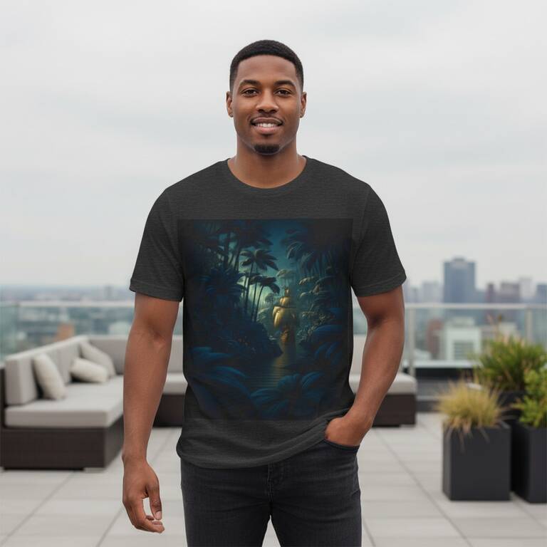 A tall sailing ship glides down a narrow jungle river. Its golden sails glowing against deep teal foliage. This shirt captures that dusk lit passage with layered shadows and warm highlights. You will reach for this shirt on cool evenings, casual meetups, or any day you want a little quiet adventure close at hand.