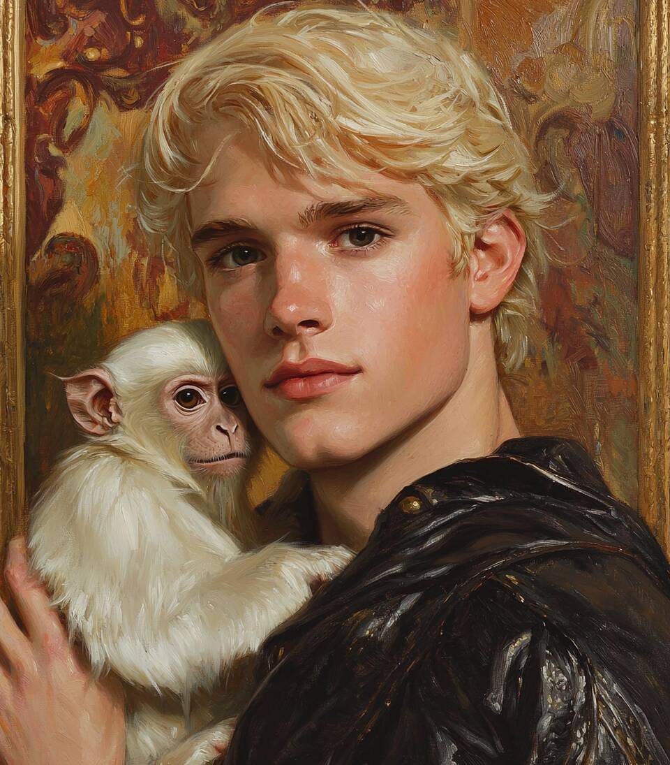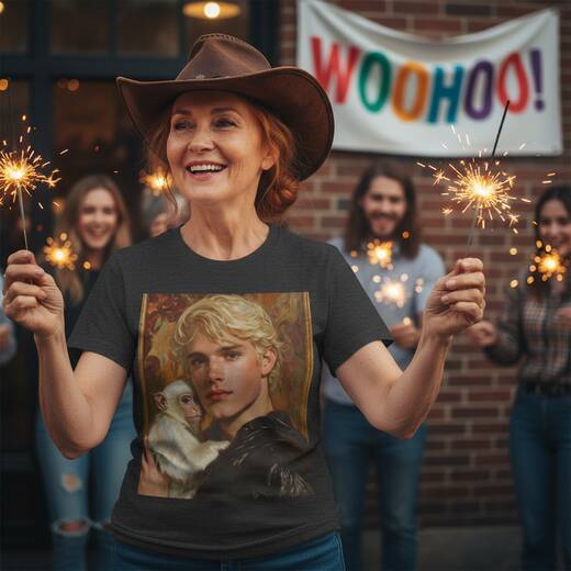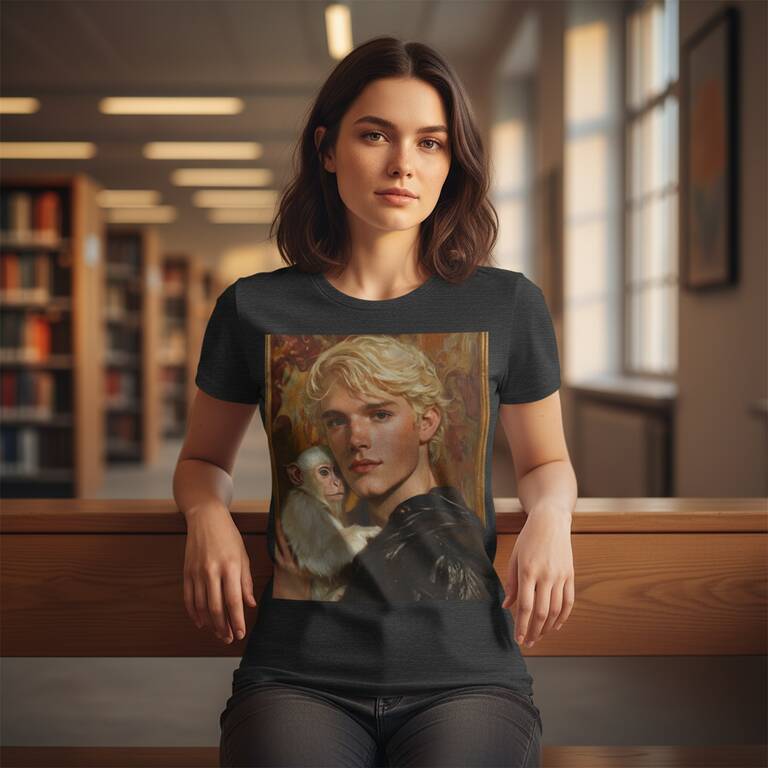 A young blond man cradling a pale, wide-eyed monkey against a gilded, painterly backdrop. On this shirt, the creamy fur, warm gold highlights, and soft skin tones bring an old master vibe that feels intimate, timeless, and a bit whimsical. Wearing it turns everyday moments into small, curious scenes when visiting friends or wandering weekend streets. Let it be a quiet conversation starter that invites you to smile.
