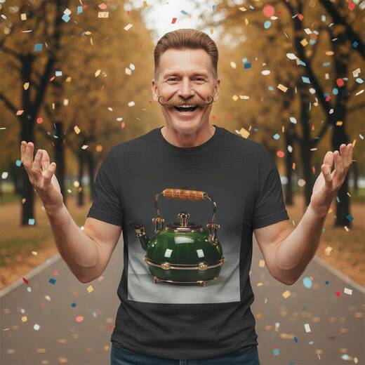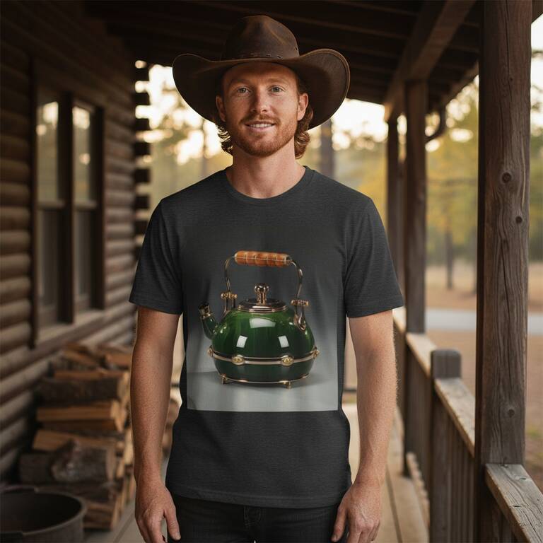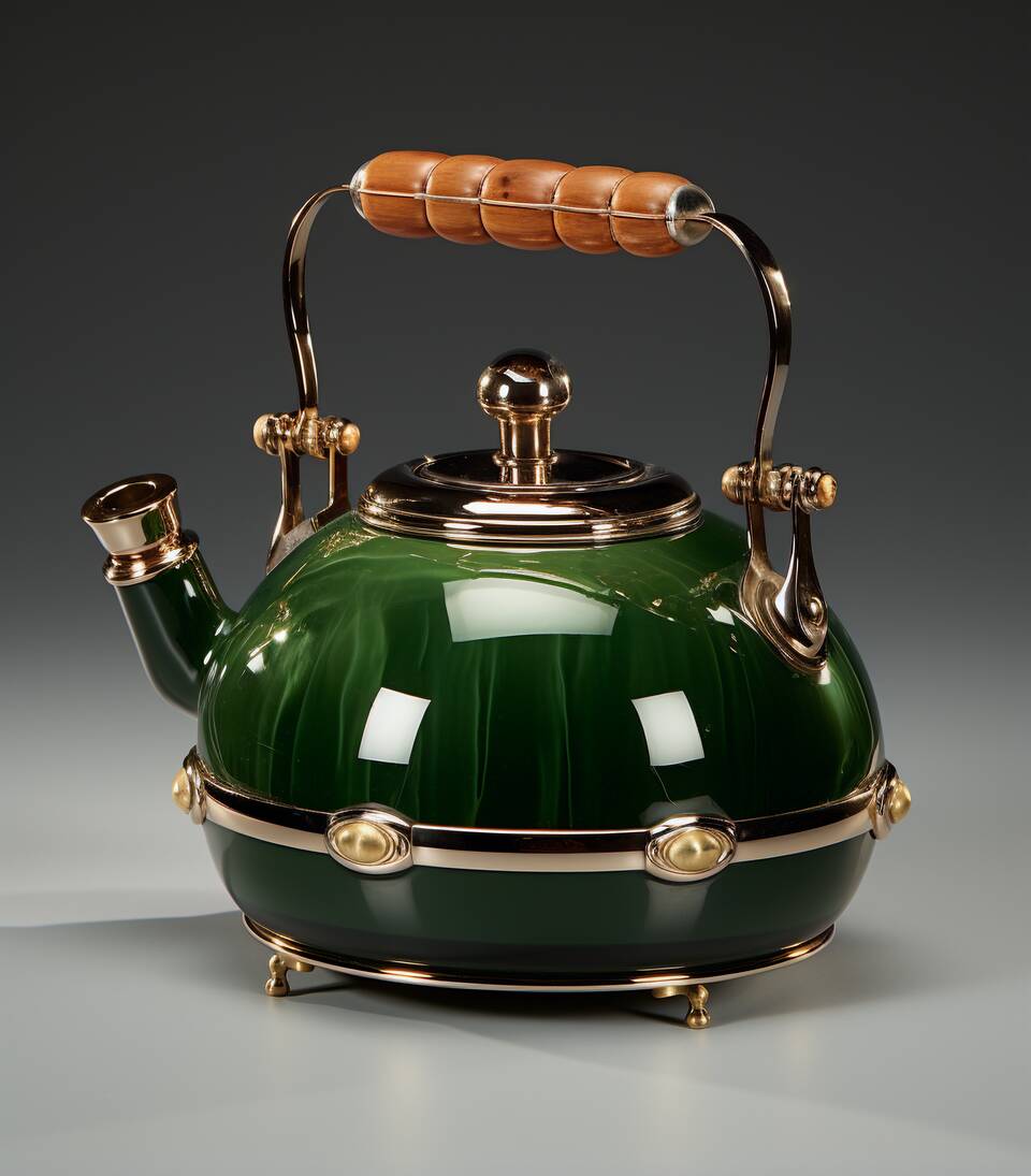 A polished emerald kettle sits like a small heirloom, with its glossy dome and warm brass fittings catching the light. On a shirt, the deep green and brass highlights create a stunning conversation piece that feels both cozy and refined. Wear it when visiting friends or on quiet, everyday mornings, and let it invite you to slow down and savor the small comforts.