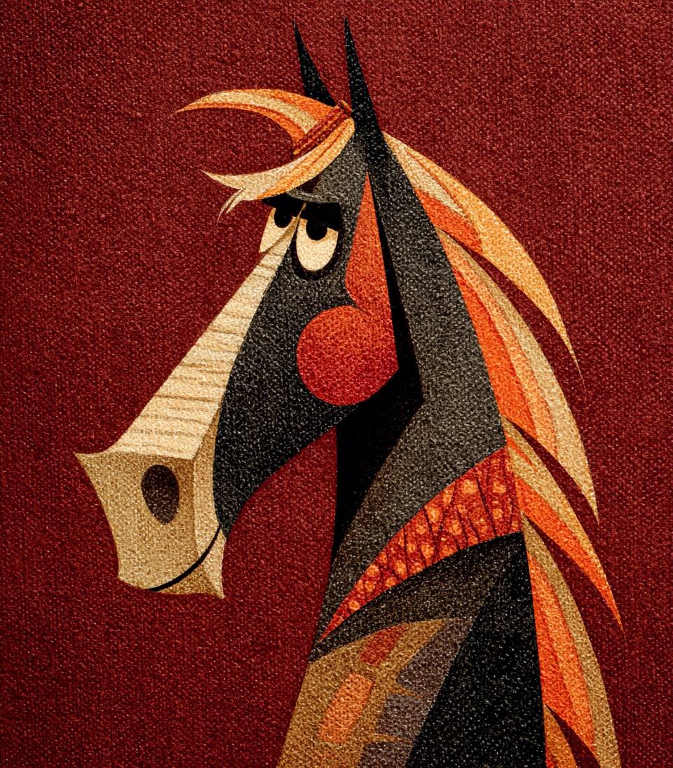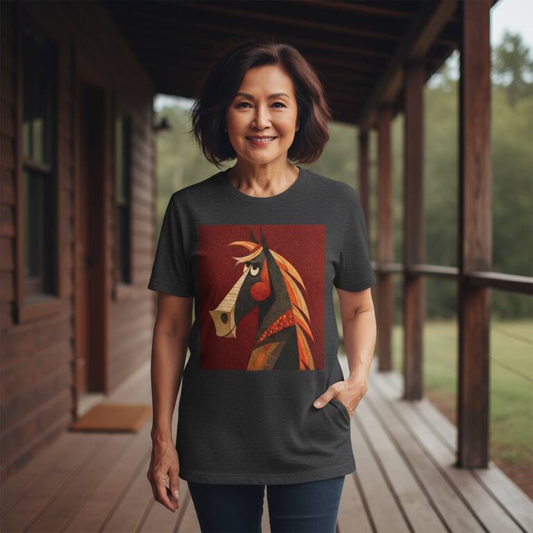 A geometric horse portrait stares outward with layered shapes, a cream muzzle, and a mane of amber and ochre. The artwork pairs angled lines and a painterly texture to create a wearable piece of art that feels both retro and fresh. Bring a quiet, joyful vibe to your day by showing your love for horses, and reach for it when meeting friends or wandering through weekend markets.