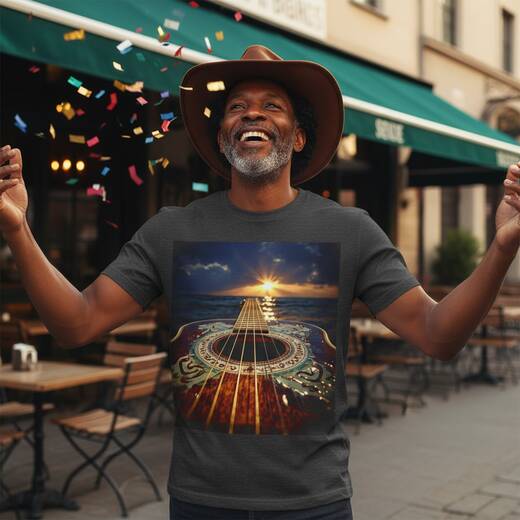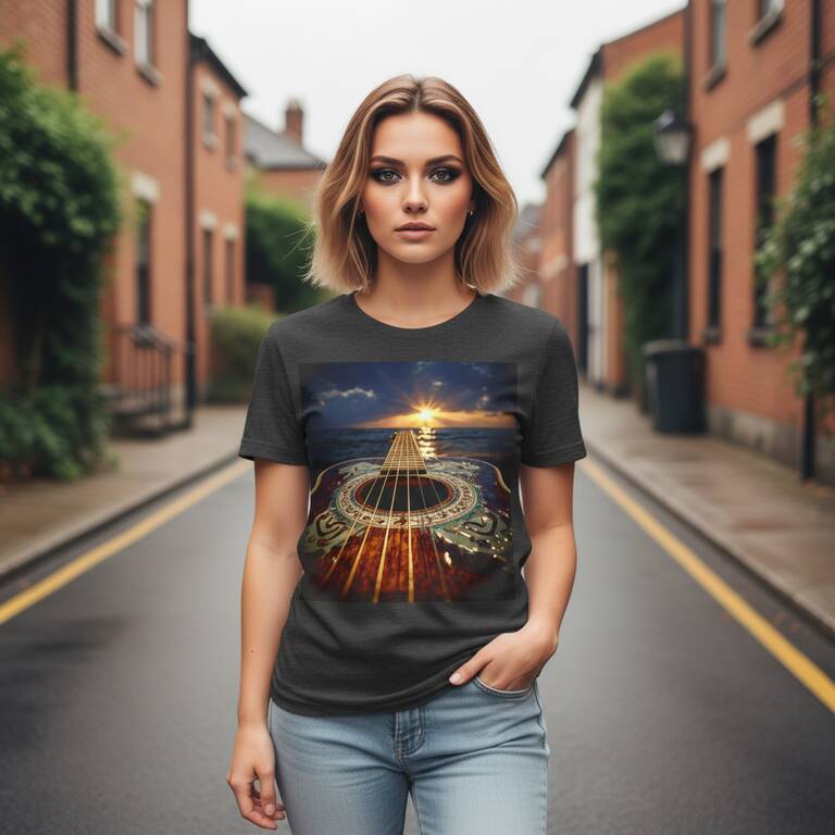 An ornate acoustic guitar stretches toward a golden sunset over the sea. On this shirt the guitar's carved rosette and sunlit strings look like a warm path across water and you'll feel that same calm when you wear it. Hand painted flourishes and glossy wood bring teal and amber highlights and create a vintage boho vibe you can carry into everyday life. Wear it visiting friends, at open mic nights, or on slow beach walks when you want music with you.