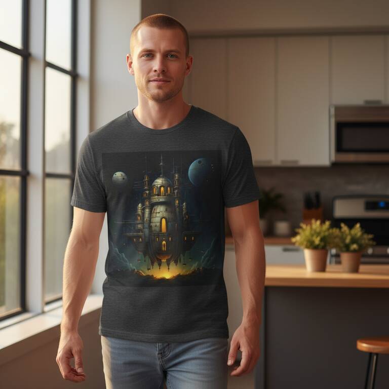 A floating steampunk castle hovers above jagged rocks, its turrets and dangling lanterns detailed in metallic panels. On a shirt it centers that warm amber glow and makes you feel like a quiet explorer drawn to distant lights. Moons wheel in a star-speckled sky while a lone silhouette stands framed in a rounded doorway, adding a whisper of story. Muted metal tones and gentle golden windows create a cozy, mysterious vibe you will reach for when visiting friends or wandering on quiet evenings.