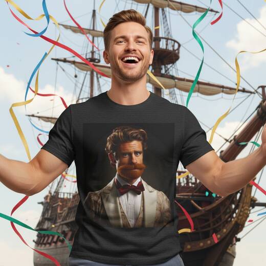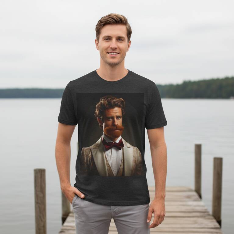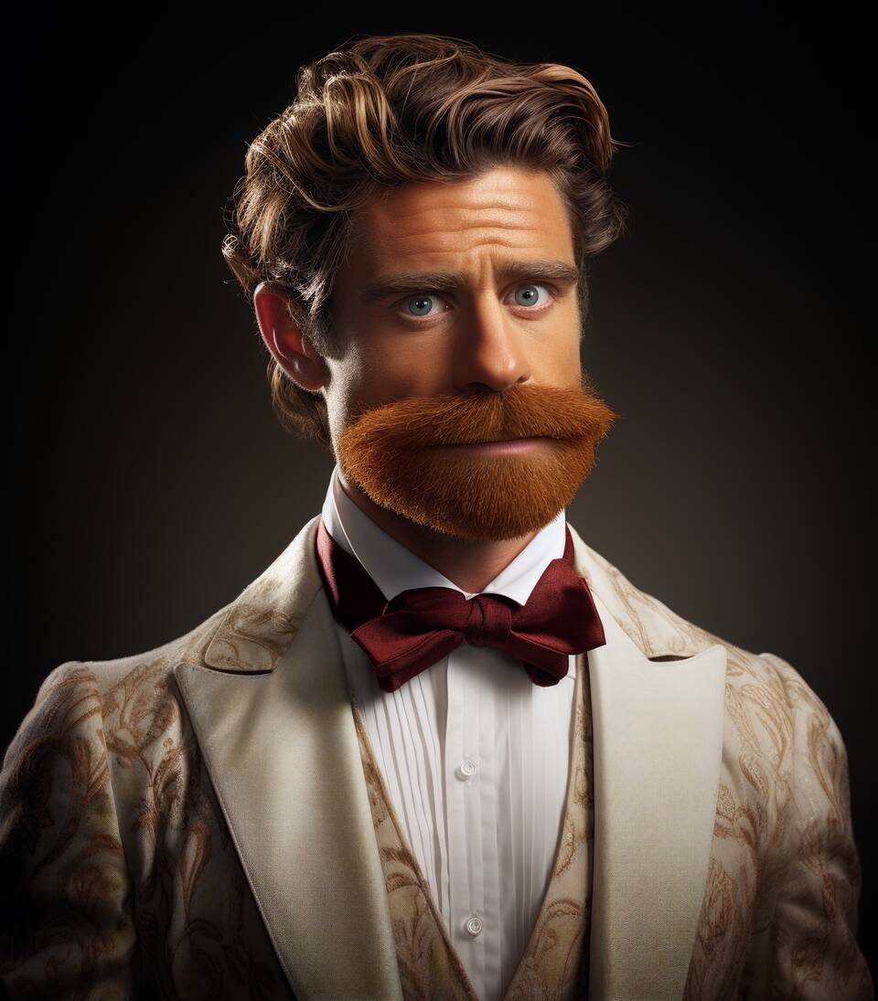 A portrait of a refined man with a cartoonish, deep auburn beard and a playful, earnest expression. His tailored waistcoat and a satin bow sit above a pleated shirt to create a luxurious yet whimsical vibe. The shirt design evokes a quiet confidence with a soft charm, and you'll reach for it for both relaxed meetups and cozy gatherings.