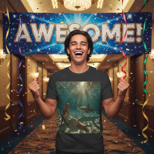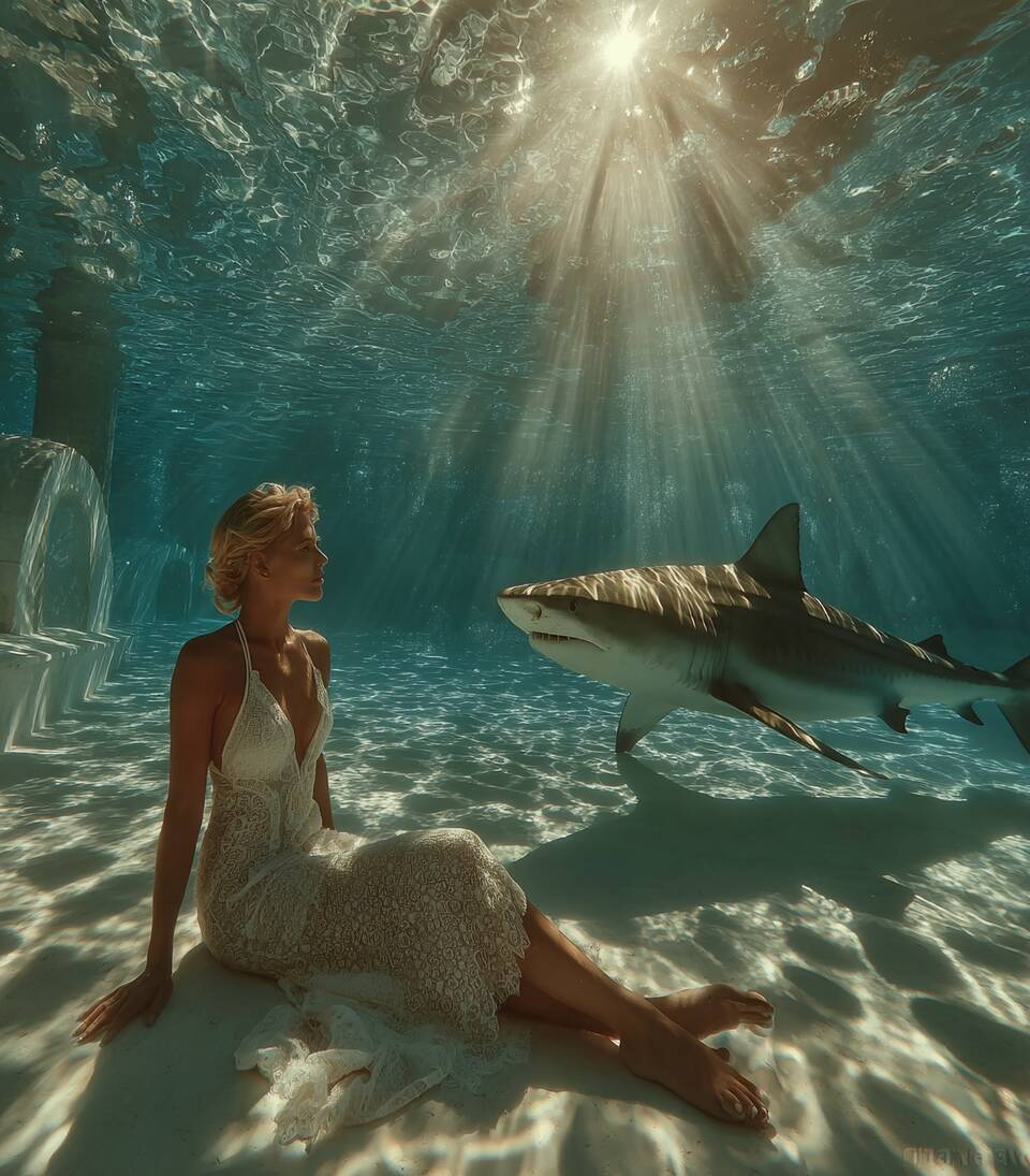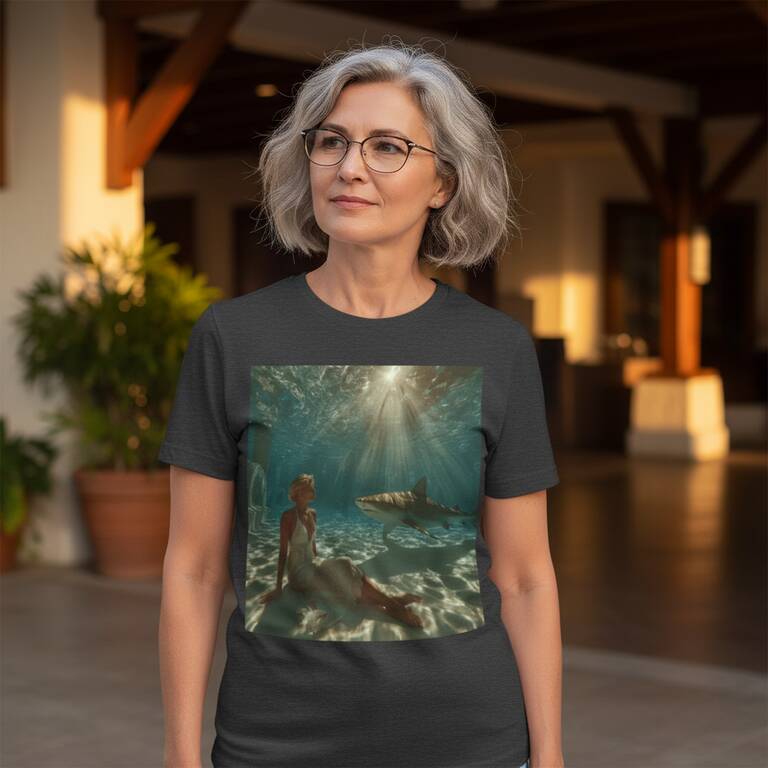 A woman in a lace dress sits on an underwater floor while a shark glides nearby beneath shafts of golden light. The shirt wraps that quiet, surreal moment in soft lines and warm highlights so wearing it feels like bringing a hidden tropical paradise to everyday places. Delicate lace motifs and sunlit ripples appear in soft coral and teal accents, creating a calm, elegant vibe you will reach for when visiting friends or wandering about.